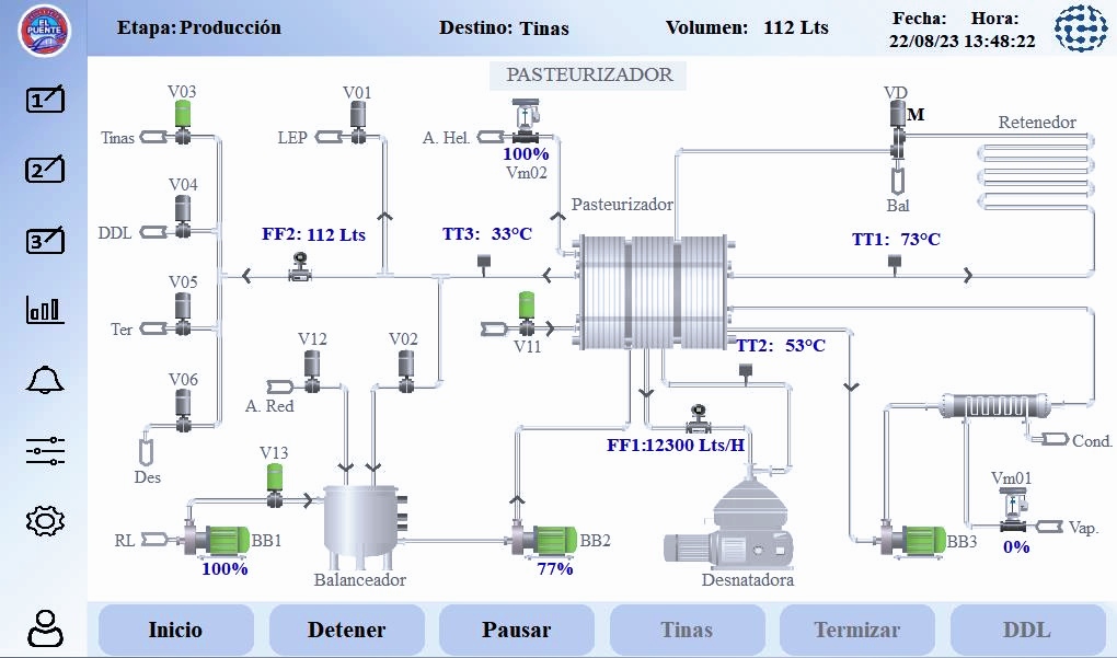 La automatización del proceso de pasteurización permitió registrar la cantidad de litros procesados para cada destino y controlar la temperatura de envío según la receta seleccionada.